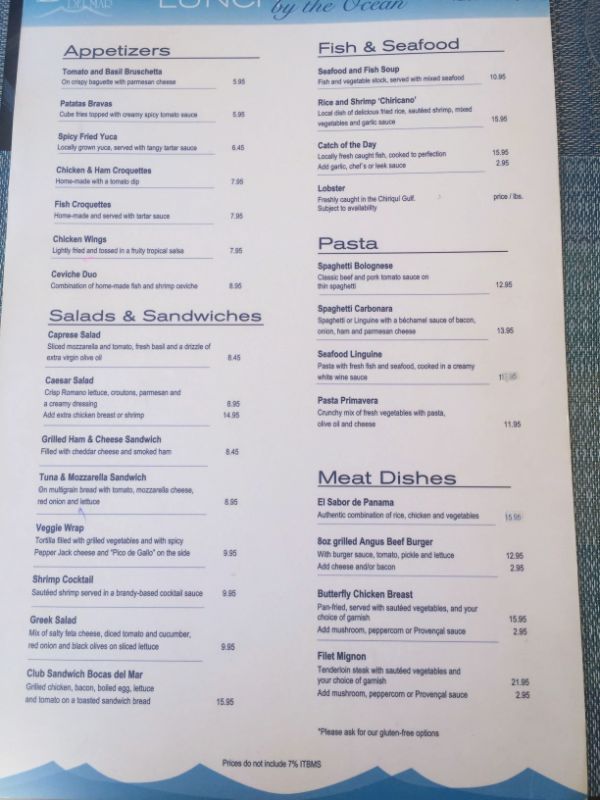 Boca Chica, Panama Restaurants La Costa Restaurante Margarita – $4.50 Daily Special with fish – $4.50 Seagull Cove Resort – open for dinner Bocas Del Mar restaurante Open area dining Sheep statues Colourful lounging chairs Beautifully landscaped garden Main entrees menu Beverage menu Refreshing Pina Colada Delicious chicken wings Fish croquettes